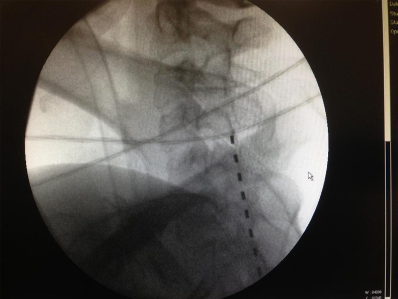 A entrada da agulha é feita através da pele até penetrar na vértebra para fazer o preenchimento com um cimento especial para a fortalecer.